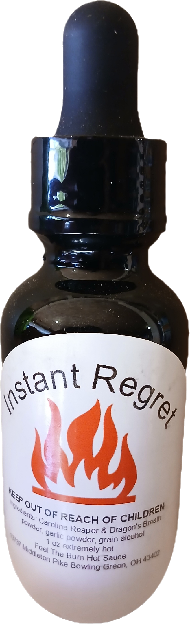 Don’t say we didn’t warn you. Instant Regret is our most intense creation — a blistering tincture crafted from Dragon’s Breath and Carolina Reaper peppers, extracted with pure grain alcohol to capture every ounce of heat and flavor.